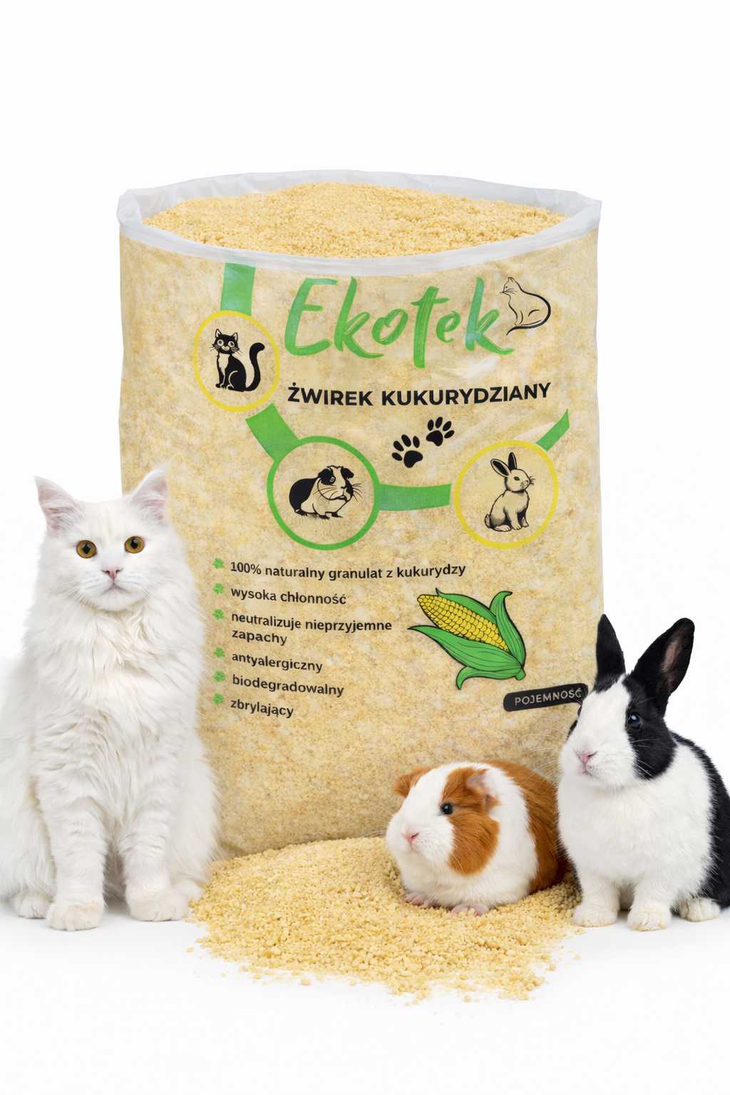 Żwirek kukurydziany EKOTEK nadaje się nie tylko dla kotów, ale również dla królików i mniejszych gryzoni. Występuje w różnych frakcjach – gruboziarnistej, drobnoziarnistej oraz w formie piasku, co pozwala dopasować rodzaj podłoża do preferencji zwierzaka i rodzaju kuwety (także automatycznych).